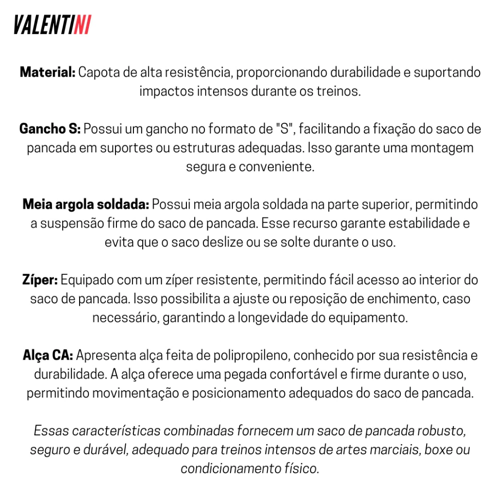 Fabricado com materiais de alta qualidade, o saco de pancada VALENTINI oferece máxima durabilidade. Sua estrutura reforçada permite suportar impactos de alta intensidade, enquanto o enchimento uniforme garante absorção eficiente, ajudando a proteger suas mãos contra lesões. As luvas inclusas também são projetadas para resistência e conforto, oferecendo proteção extra durante seus treinos.